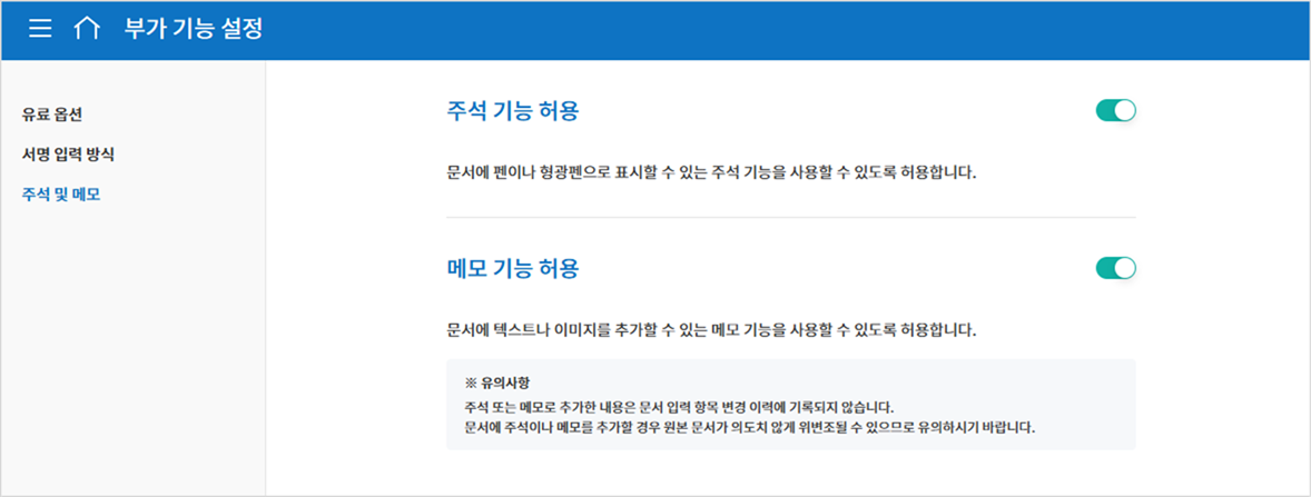 문서 작성 시 펜/형광펜으로 표시할 수 있는 주석 기능과 메모 기능의 사용 여부를 설정할 수 있습니다.