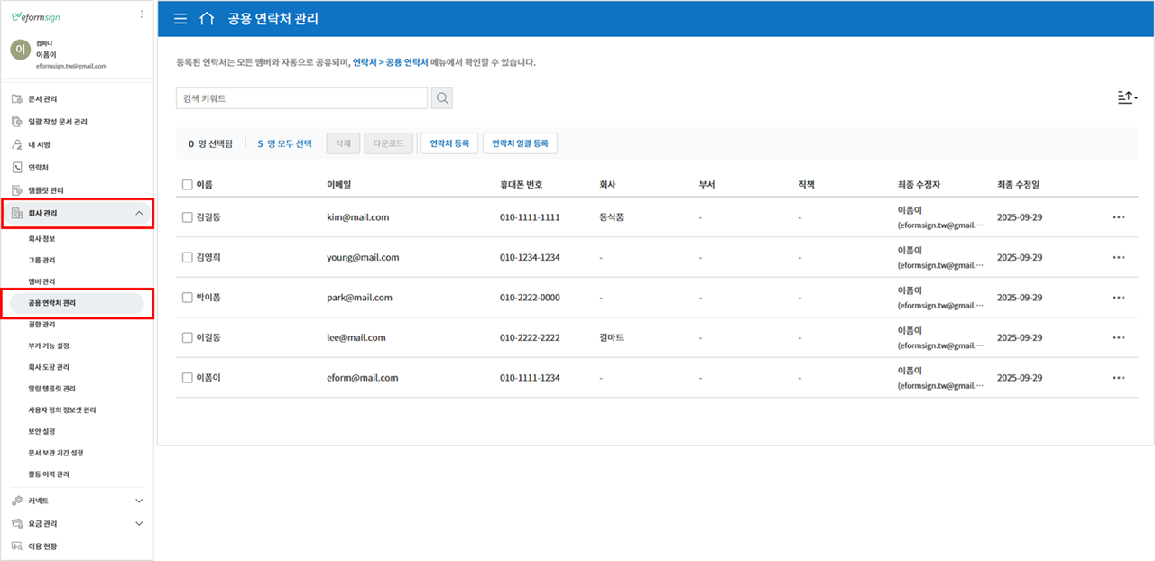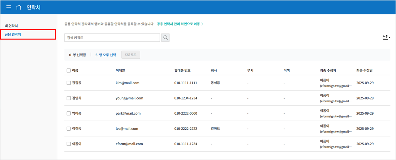 공용 연락처: 회사 또는 대표 관리자가 등록한 외부 수신자의 연락처를 확인할 수 있습니다.