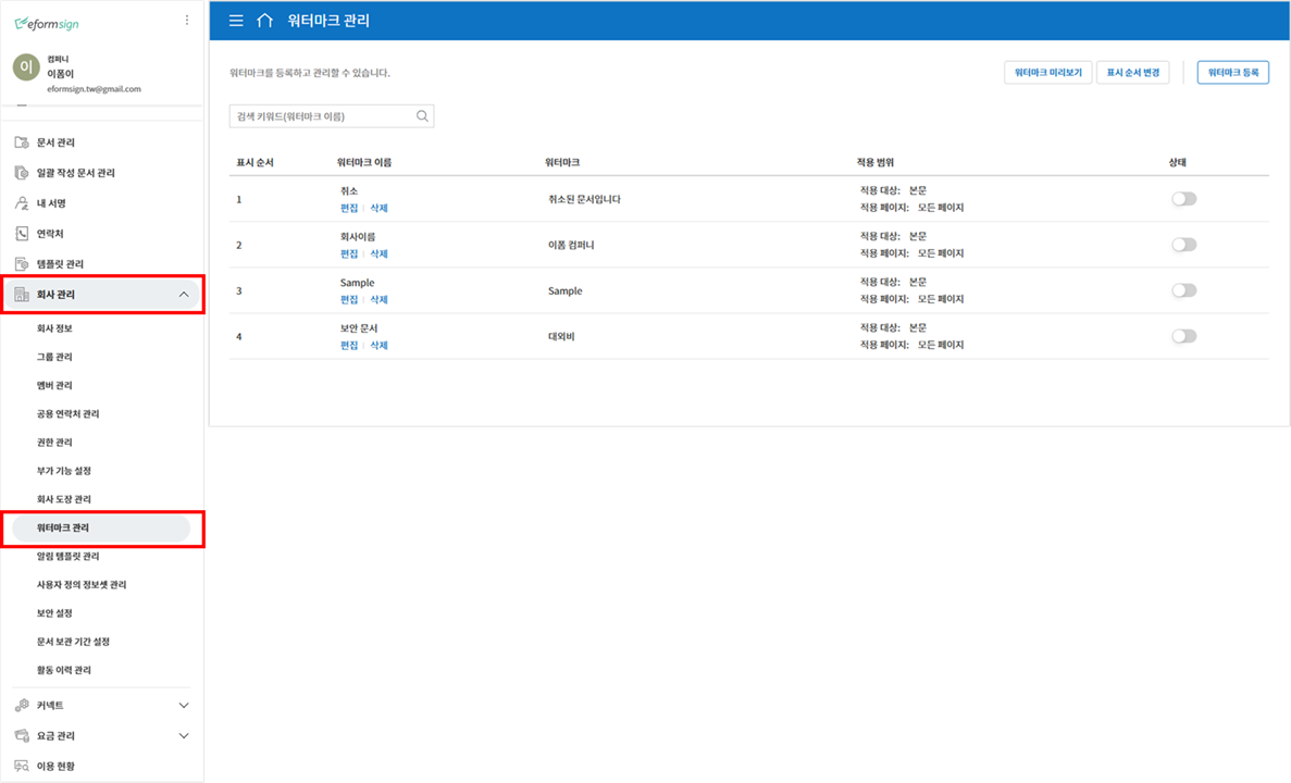 문서에 표시할 워터마크를 등록하고 관리할 수 있습니다.