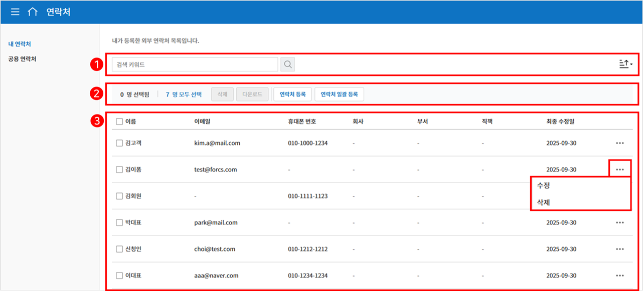 내 연락처: 외부 수신자의 연락처를 등록하고 관리할 수 있습니다.