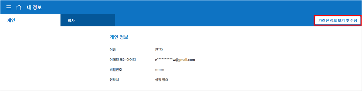이름, 이메일 등 개인 정보는 가려진 상태로 표시됩니다. 정보를 확인 및 수정하려면 상단의 가려진 정보 보기 및 수정 버튼을 클릭하여 비밀번호를 한번 더 입력해야 합니다. ※ 내 정보 메뉴 내에서 이동 시(개인 ↔ 회사)에는 본인확인을 다시 진행하지 않아도 됩니다.