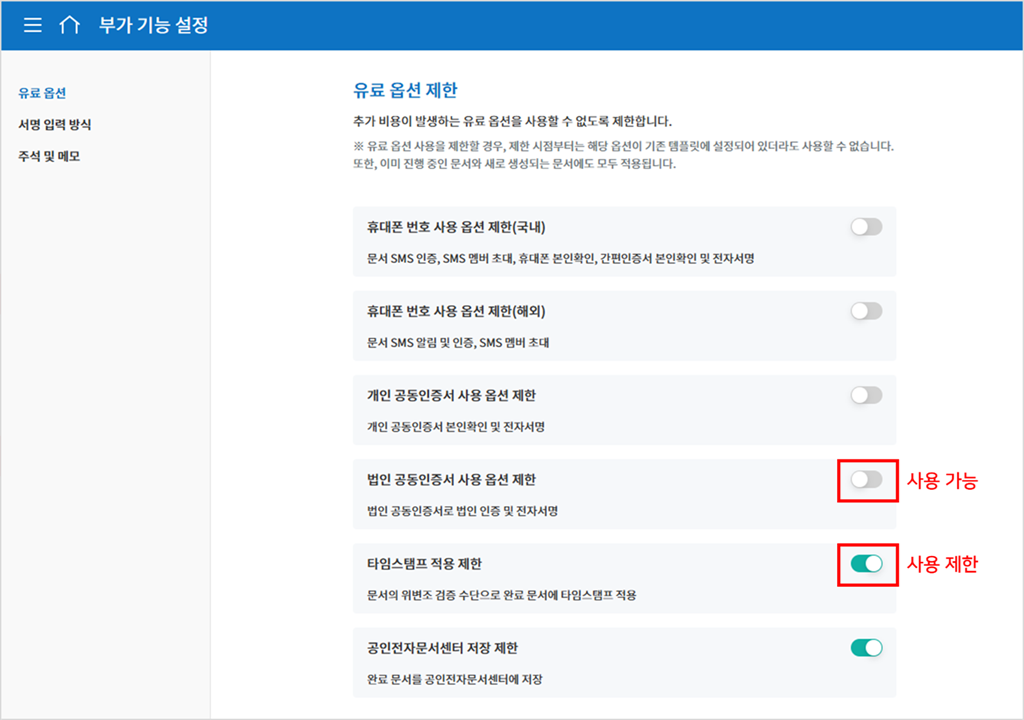 휴대폰 본인확인, 타임스탬프 등 추가 비용이 발생하는 옵션의 사용 여부를 설정할 수 있습니다. 기본 설정은 모든 옵션의 사용이 가능하며, 옵션 제한을 활성화(ON)하면 회사 전체, 모든 멤버에게 즉시 적용되어 해당 기능을 사용할 수 없습니다.