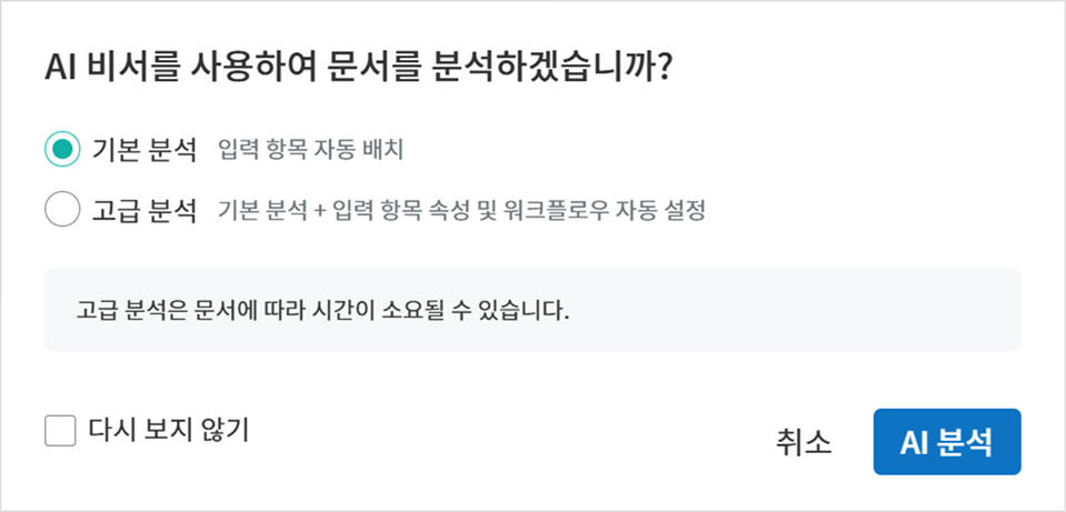 문서의 구성이나 크기에 따라 분석 소요 시간이 달라질 수 있으며, 고급 분석은 시간이 다소 소요될 수 있습니다.